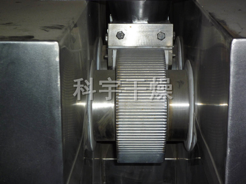 對輥式擠壓造粒的工藝原理是:干物料在壓力作用下團聚成致密堅硬的大塊(餅料),稱(chēng)為擠壓過(guò)程;餅料再被破碎篩分后成為顆粒料稱(chēng)為造粒過(guò)程。擠壓的作用一是將顆粒間的空氣擠掉,另外是使顆粒間距達到足夠近,以產(chǎn)生如范德華力、吸附力、晶橋及內嵌連接等吸引力。擠壓造粒的顆粒主要是靠分子之間的作用力形成的顆粒強度。