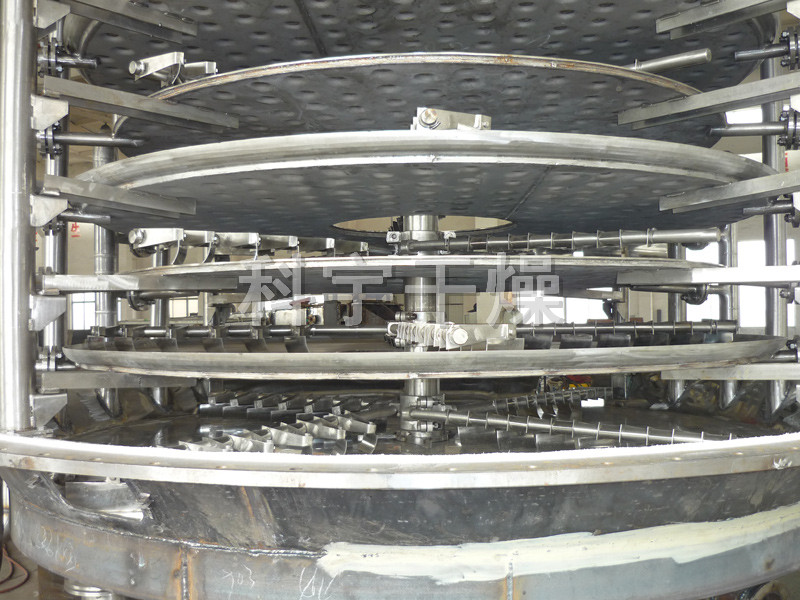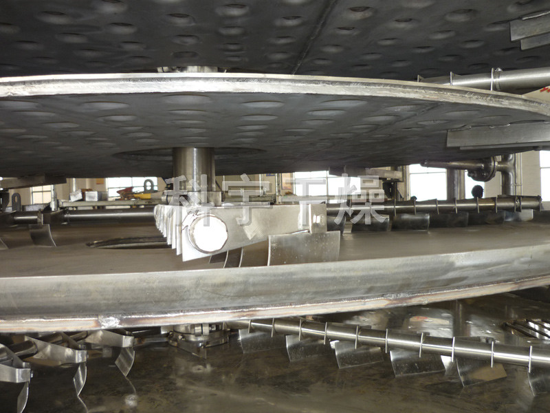濕物料自加料器連續地加到干燥器上部第一層干燥盤(pán)上,帶有耙葉的耙臂作回轉運動(dòng)使耙臂作回轉運動(dòng)使耙葉連續地翻抄物料。物料沿指數螺旋線(xiàn)流過(guò)干燥盤(pán)表面,在小干燥盤(pán)上的物料被移送到外緣,并在外緣落到下方的大干燥盤(pán)外緣,在大干盤(pán)上物料向里移動(dòng)并從中間落料口落如下一層小干燥盤(pán)中。大小干燥盤(pán)上下交替排列,物料得以連續地流過(guò)整個(gè)干燥器。中空的干燥盤(pán)內通入加熱介質(zhì),加熱介質(zhì)形式有飽和蒸汽、熱水和導熱油,加熱介質(zhì)由干燥盤(pán)的一端進(jìn)入,從另一端導出。已干物料從最后一層干燥盤(pán)落到殼體的底層,最后被耙葉移送到出料口排出。濕份從物料中逸出,由設在頂蓋上的排濕口排出,真空型盤(pán)式干燥器的濕氣由設在頂蓋上的真空泵口排出。從底層排出的干物料可直接包裝。通過(guò)配加翅片加熱器、溶劑回收冷凝器、袋式除塵器、干料返混機構、引風(fēng)機等輔機,可提高其干燥的生產(chǎn)能力,干燥膏糊狀和熱敏性物 料,可方便地回收溶劑,并能進(jìn)行熱解和反應操作。