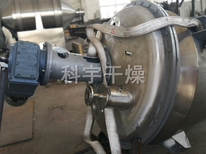 三合一單錐螺帶錐形真空干燥機是一種利用螺帶將物料旋轉提升及圓錐夾套、空心螺帶內同時(shí)通入傳熱介質(zhì)(如熱水、導熱油、蒸汽等),使加熱后物料從四周提升并從中間下落,快速不斷的循環(huán)翻轉,并通過(guò)筒體內抽真空將水汽及時(shí)帶走, 使物料在短時(shí)間內達到干燥和混合目的。與傳統的立式混合機相比,筒體內無(wú)任何傳動(dòng)機構,從根本上杜絕因潤滑油泄漏而導致物料污染,運行可靠穩定,特別適宜衛生要求高的粉料、顆?;旌?;同時(shí)也適用于粘性流體或稠狀、濕狀為主物料的攪拌混合;與其它臥式干燥機相比,具有出料方便,可以100%完全出料,操作、維修方便。它的干燥效率是同等規格“雙錐回轉真空干燥機”3-5倍。